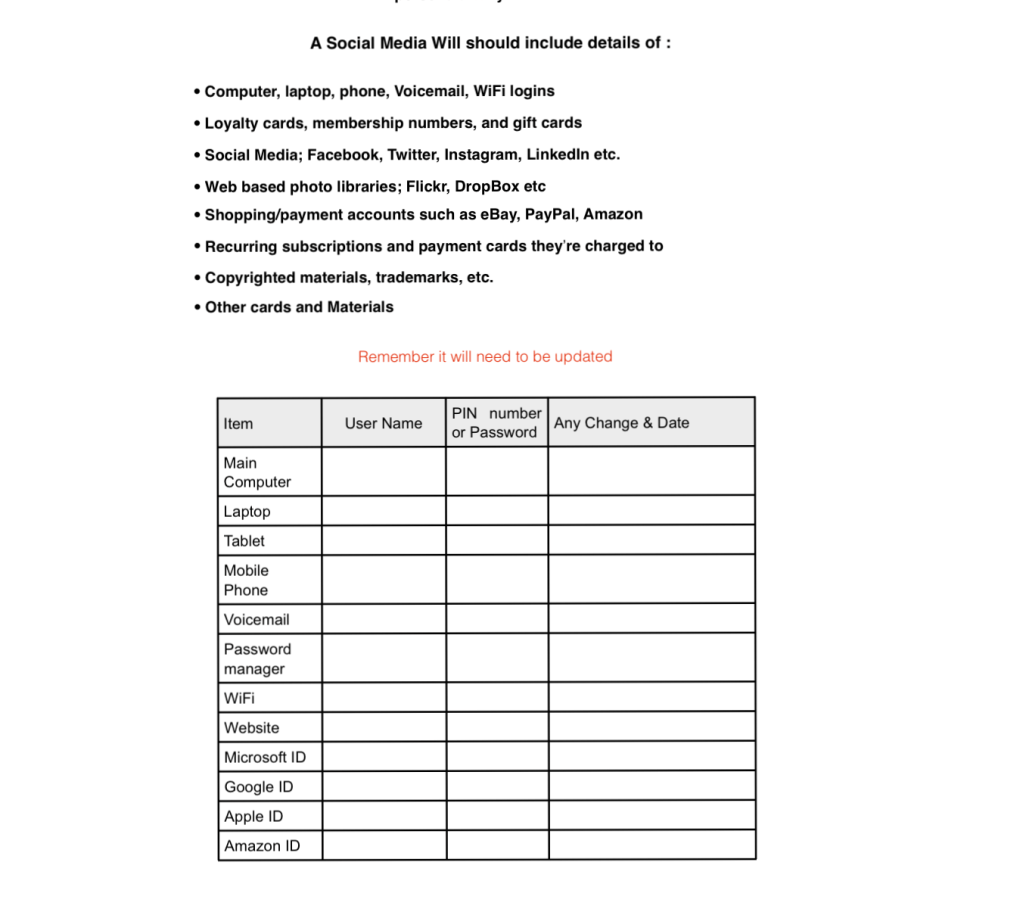 2025 is up and running, it is time to look forward to Spring Cleaning! Is this the year to see about getting to grips with the changes that have occurred over the last 10 years. We have a digital life and a social media life that is forever changing, and with that comes many parts of our life that is kept only known to us. We have to keep it up to date, and insure that those need to know how to access it can do so. Completing the Plan will save those you love a big headache in the future – whatever that may bring. I have devised a document to help you gather together all those bits of information – some important and others seemingly insignificant – that together help make our lives tick. Collating this information will make it possible for those we love to unlock the various parts of our lives, should we no longer be able to do so.